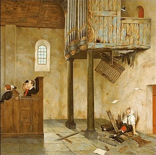 Tot ons verdriet maakte Henk ter Horst enige weken geleden bekend dat hij om gezondheidsredenen moest stoppen met orgelspelen. Hij is vijftig jaar(!) organist geweest in onze gemeente. Twee weken geleden speelde hij zijn laatste dienst. Afgesproken was dat we op zondag 12 april officieel afscheid zouden nemen. Henk en zijn partner Martin Korenhof waren samen aanwezig in de dienst. Er waren toespraken door ds. Pierre Eijgenraam en door onze voorzitter Cees van Bruggen en er werden twee cadeaus overhandigd: een schilderij van Marius van Dokkum, getiteld ‘A Capella’ en een oorkonde met bijbehorende plaquette.